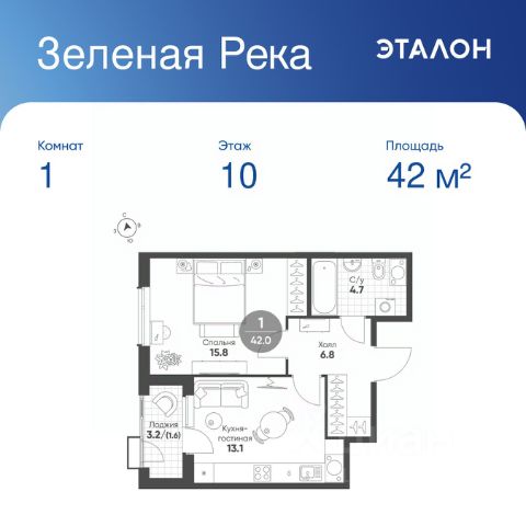 Продается 1-к квартира без отделки в ЖК "Зеленая Река". Общая площадь квартиры — 42 кв. м, этаж 10 из 11. Тип дома — монолитный. Цена указана при 100% оплате.