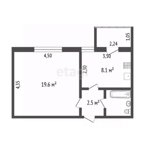 из 30,4 кв.м квартира + 2.4 кв.м балкон.
