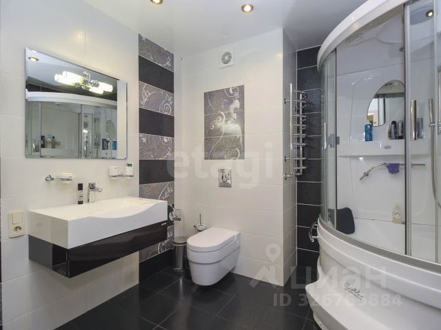 Оба санузла облицованы керамической плиткой, в одном из них установлена небольшая ванная с видовым окном,система инсталляции. Рядом расположена душевая и сауна. В гостевом санузле раковина и система инсталляции.