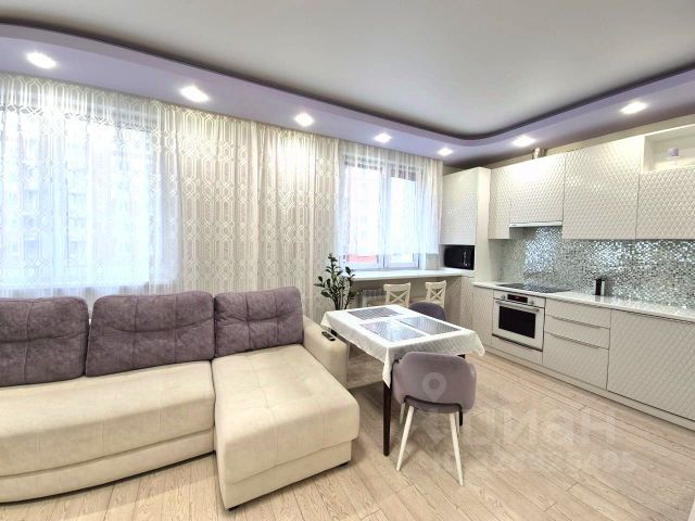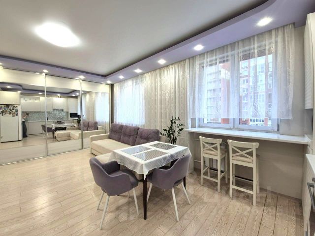 Квартира площадью 98.7 кв.м. расположена на 4 этаже 17-этажного каркасно-монолитного дома 2017 года постройки. Высокие потолки 3 метра. Комфортная планировка включает просторную кухню-гостиную 32 кв.м, две изолированные комнаты: спальню 16,2 кв.м. с гардеробной комнатой 4.1 кв.м. (со встроенной системой хранения) и выходом на полукруглую лоджию, комнату 20.1 кв.м. с выходом на балкон, ванную комнату 6.6 кв.м. с гидромассажной ванной и душевой зоной, второй санузел 3.2 кв.м. с душевой, прачечную комнату 2.2 кв.м., просторный коридор 11.2 кв.м. с подсветкой в плинтусе.