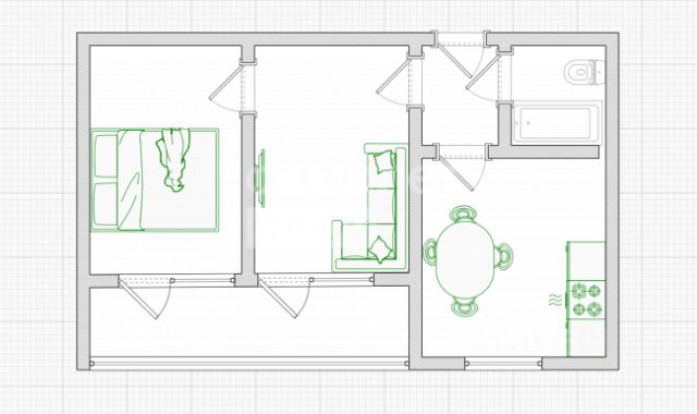 Удобная планировка предусматривает большую кухню гостиную с выходом на застеклённый балкон, постирочное помещение с нишей для предметов быта, отдельную гардеробную, совмещённый санузел, спальную комнату и просторный коридор.