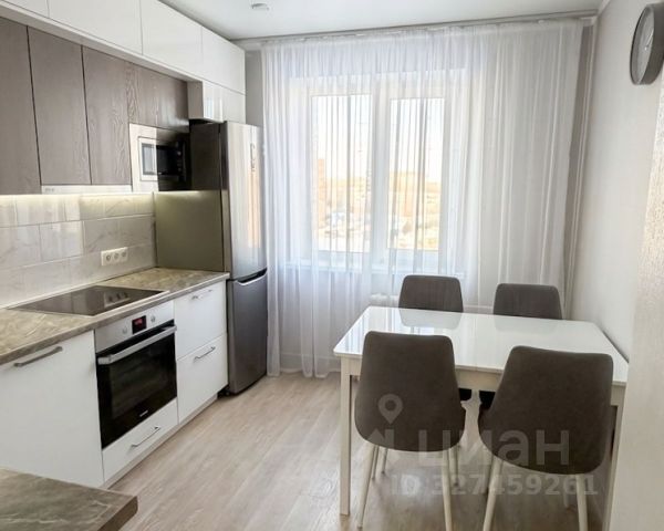 Современная кухня с кухонным гарнитуром, качественной бытовой техникой (варочная панель, духовка, вытяжка, холодильник) .