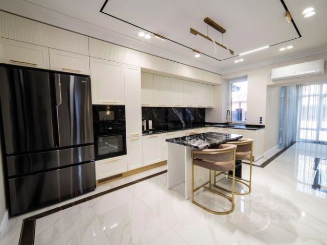 Небольшое описание меблировки дома, которое приведет Вас в восторг при личном посещении: кухонный гарнитур, сделанный на заказ, оборудован встроенной бытовой техникой, таких фирм как Samsung, AEG, Haier, столешница кухонного гарнитура выполнена из природного камня, кухонная раковина из камня оборудована измельчителем, обеденный стол изготовлен из мрамора, покрытого защитной пленкой. Вся мебель в доме изготовлена в студии Арт-мебель по индивидуальному дизайн - проекту.
