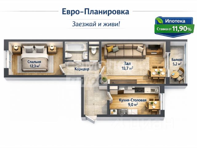 Квартира со свободной планировкой с общей площадью 46,7 м2 и огромной лоджией 7,7 м2
