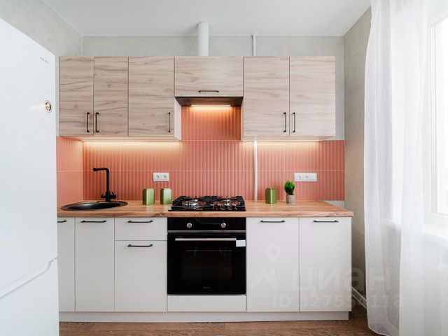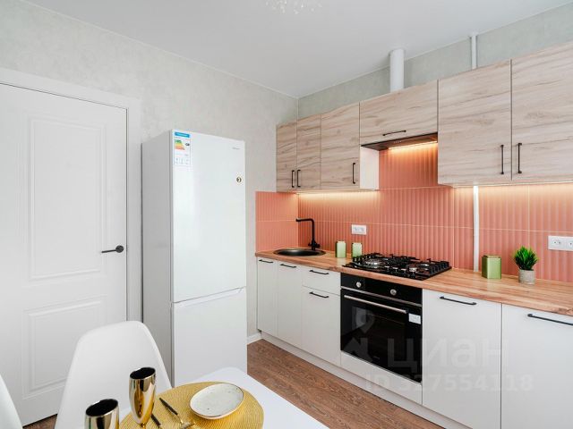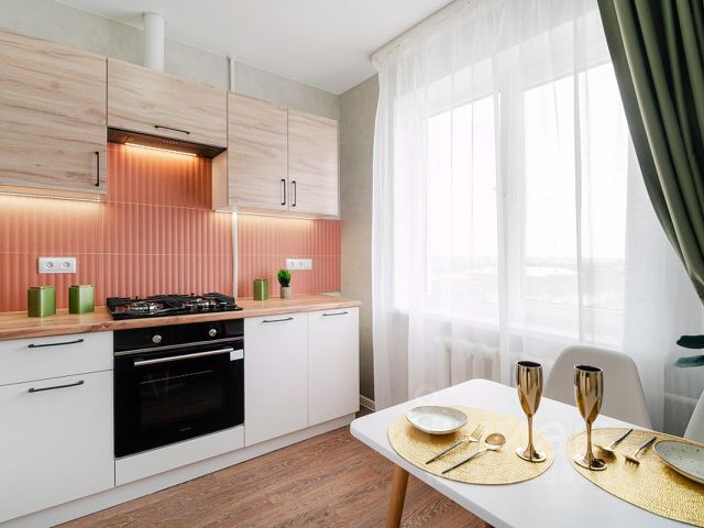 Квартира оборудована необходимой мебелью и техникой, всё, что на фото остается новым собственникам - современный кухонный гарнитур с варочной поверхностью, вытяжка, духовой шкаф, холодильник, встроенный шкафы, шторы, диван, обеденная зона, элементы декора.