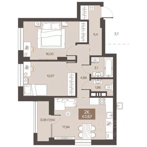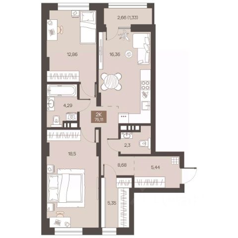 Продаётся 3-комнатная квартира в строящемся доме (Дом 1), срок сдачи: I-кв. 2027, общей площадью 77.76 кв.м., на 2 этаже.