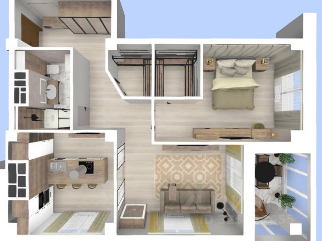 Формат - свободная планировка, что позволяет организовать пространство под индивидуальные задачи: выделить кухню, зону отдыха, спальню или рабочее место.