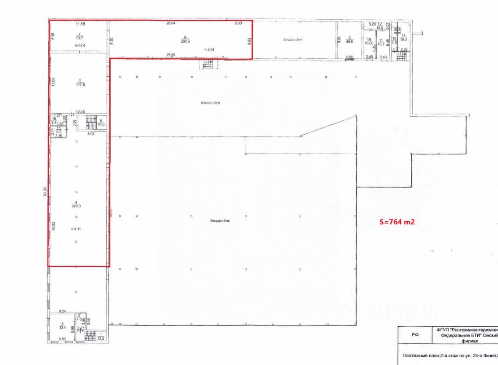 - Второй этаж: 764 м²