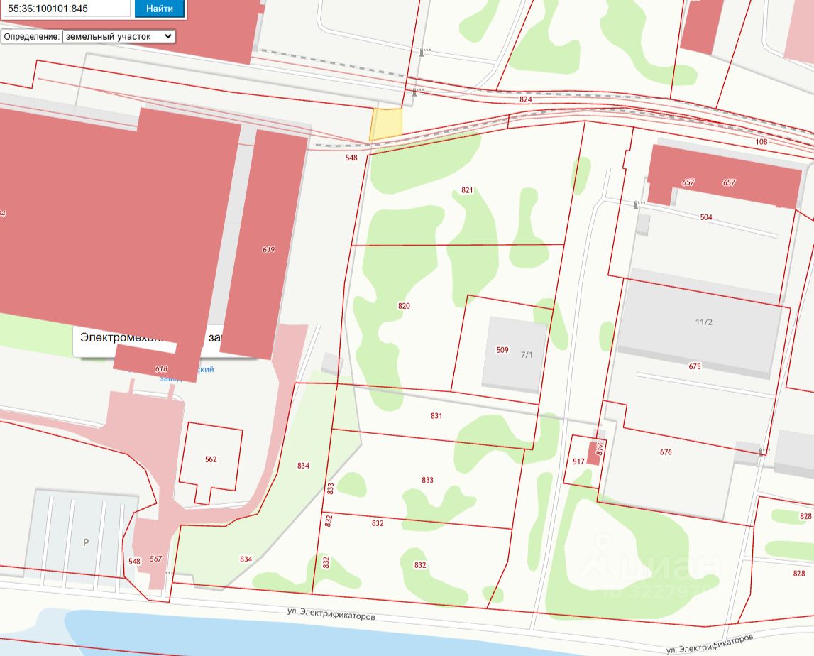 Земельный участок из состава земель населенных пунктов с кадастровым номером 55:36:100101:845. Местоположение земельного участка установлено в 127 м западнее относительно здания, расположенного по адресу: Омская область, город Омск, Кировский административный округ, улица Электрификаторов, дом 13. Площадь земельного участка: 200 кв. м.