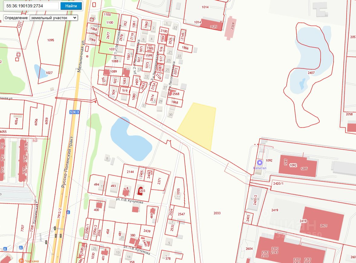 Земельный участок из состава земель населенных пунктов с кадастровым номером 55:36:190139:2734. Местоположение земельного участка установлено в 125 м юго-восточнее относительно жилого дома, расположенного по адресу: Омская область, город Омск, Кировский административный округ, улица 4-я Лесоперевалка, дом 26. Площадь земельного участка: 5968 кв. м.