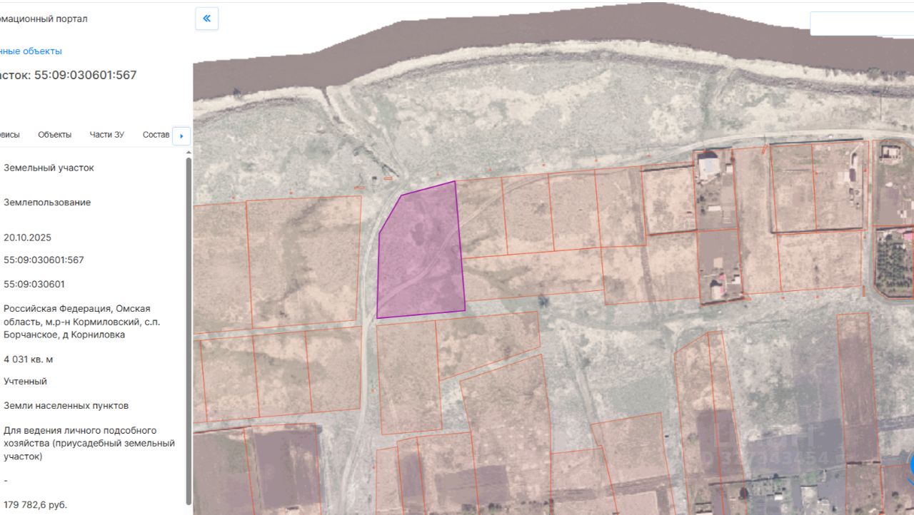 Лот 1 - земельный участок с кадастровым номером 55:09:030601:567, площадью 4031 кв. м., категория земель: земли населенных пунктов, вид разрешенного использования: для ведения личного подсобного хозяйства (приусадебный земельный участок), местоположение: Российская Федерация, Омская область, Кормиловский район, с. п. Борчанское, д. Корниловка