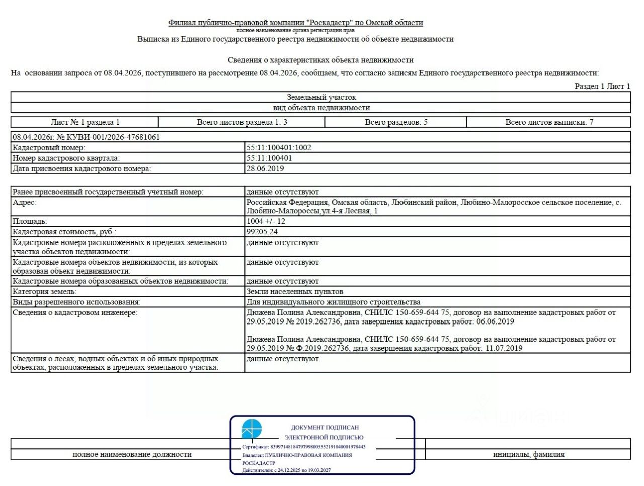Земельный участок из земель населенных пунктов сроком на 20 лет, расположенный по адресу: Омская область, Любинский район, с. Любино-Малороссы, ул. 4-я Лесная, д. 1, площадью 1004 кв.м, с кадастровым номером 55:11:100401:1002, вид разрешенного использования: для индивидуального жилищного строительства