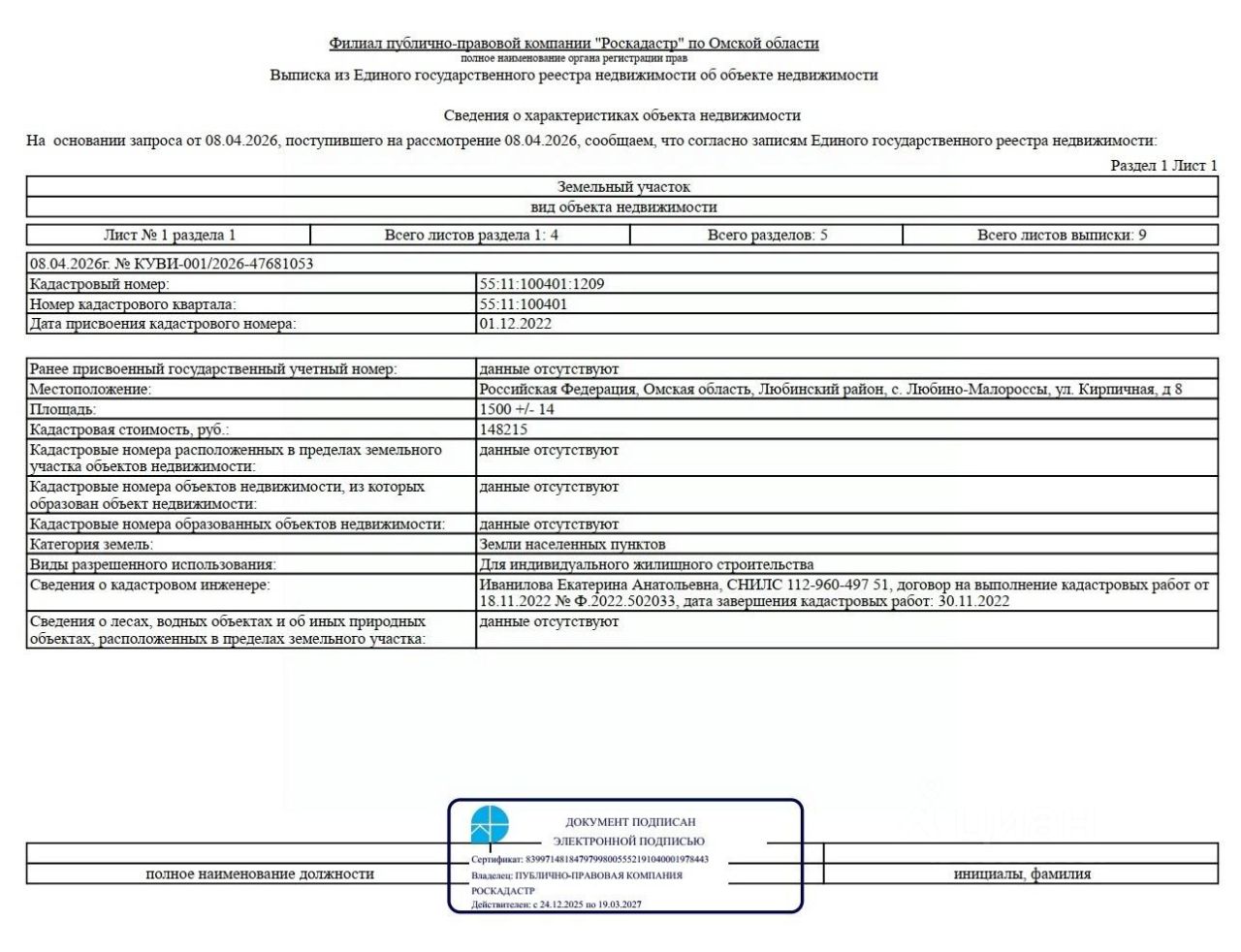 Земельный участок из земель населенных пунктов сроком на 20 лет, расположенный по адресу: Омская область, Любинский район, с. Любино-Малороссы, ул. Кирпичная, д. 8, площадью 1500 кв.м, с кадастровым номером 55:11:100401:1209, вид разрешенного использования: для индивидуального жилищного строительства.