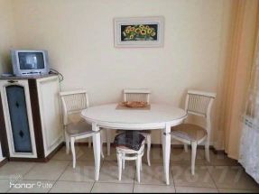 Кухня:встроенный кухонный гарнитур, холодильник, микроволновка, стол со стульями, есть посуда.
