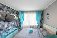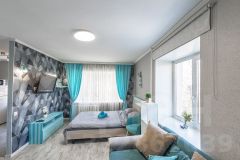 Светлый интерьер в приятных серо-бирюзовых тонах создаёт атмосферу уюта и спокойствия.