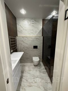 Стильным решением ремонта квартиры является подвесная тумба с раковиной, зеркало, система инсталляции с подвесным унитазом, стеклянная душевая перегородка.