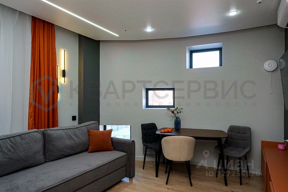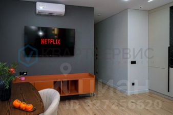 -В гостиной расположены зона отдыха и обеденная зона, вся мебель новая, установлены большой телевизор и кондиционер. Разные вариации освещения с голосовым управлением.