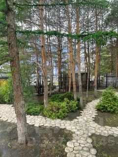 • Ухоженный двор с посадками, хвойными деревьями (сосны, туи) и цветущей сиренью создает атмосферу уединения и гармонии с природой.