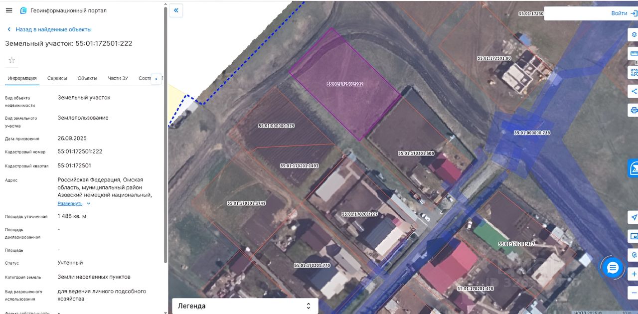 Земельный участок с кадастровым номером 55:01:172501:222, площадью 1486 +/- 13 кв. м., расположенный по адресу: Российская Федерация, Омская область, муниципальный район Азовский немецкий национальный, сельское поселение Гауфское, деревня Гауф, вид разрешенного использования для ведения личного подсобного хозяйства, цель предоставления земельного участка для ведения личного подсобного хозяйства, из земель населенных пунктов.