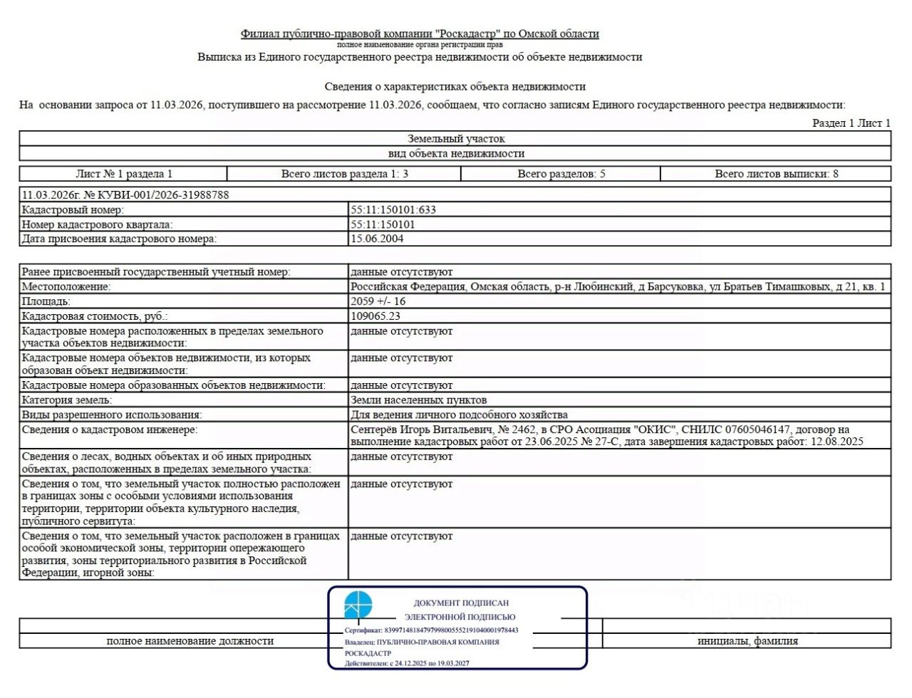 Земельный участок из земель населенных пунктов, расположенный по адресу: Омская область, Любинский район, д. Барсуковка, ул. Братьев Тимашковых, д. 21, кв. 1, площадью 2059 кв.м, с кадастровым номером 55:11:150101:633, вид разрешенного использования: для ведения личного подсобного хозяйства.