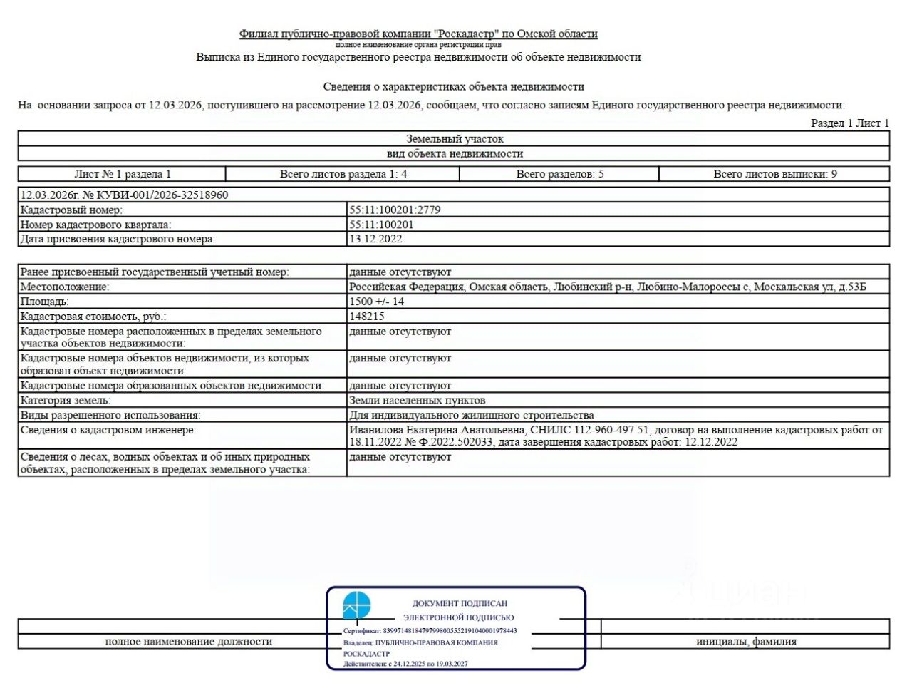 Земельный участок из земель населенных пунктов, расположенный по адресу: Омская область, Любинский район, с. Любино-Малороссы, ул. Москальская, д. 53Б, площадью 1500 кв.м, с кадастровым номером 55:11:100201:2779, вид разрешенного использования: для индивидуального жилищного строительства.