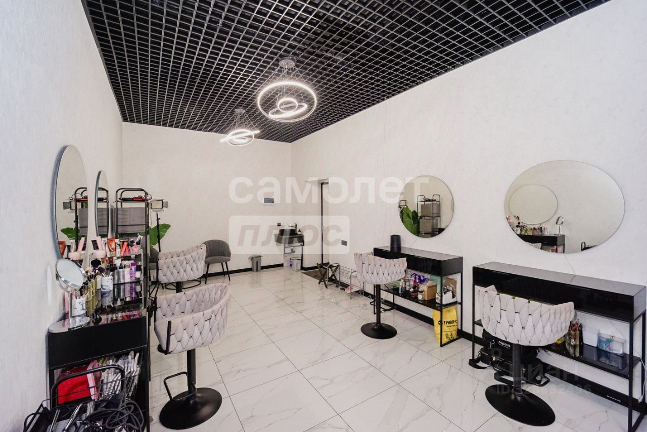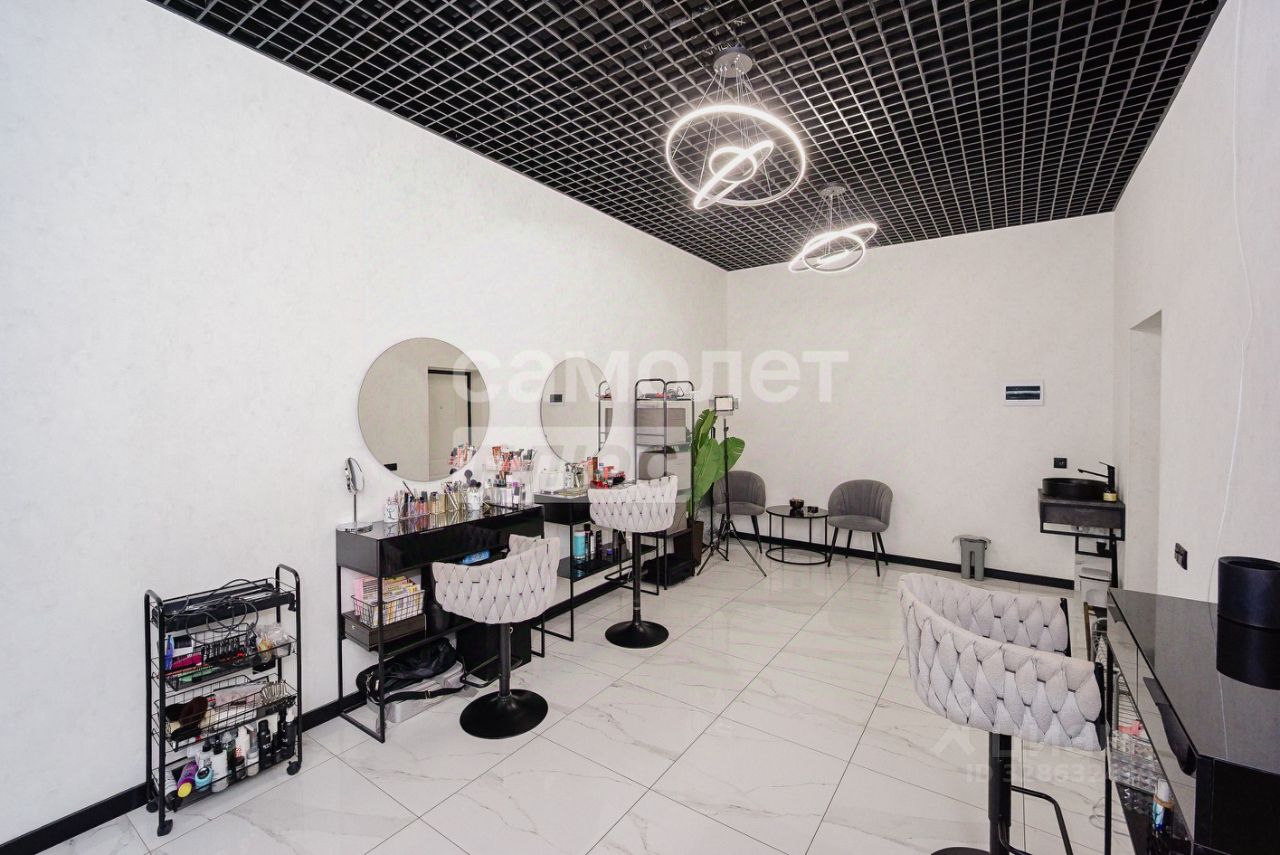 2. Интерьер: Светлые стены, зеркала с подсветкой, современный черный потолок "Грильято", износостойкий пол (керамогранит). Помещение выглядит очень просторным и чистым.