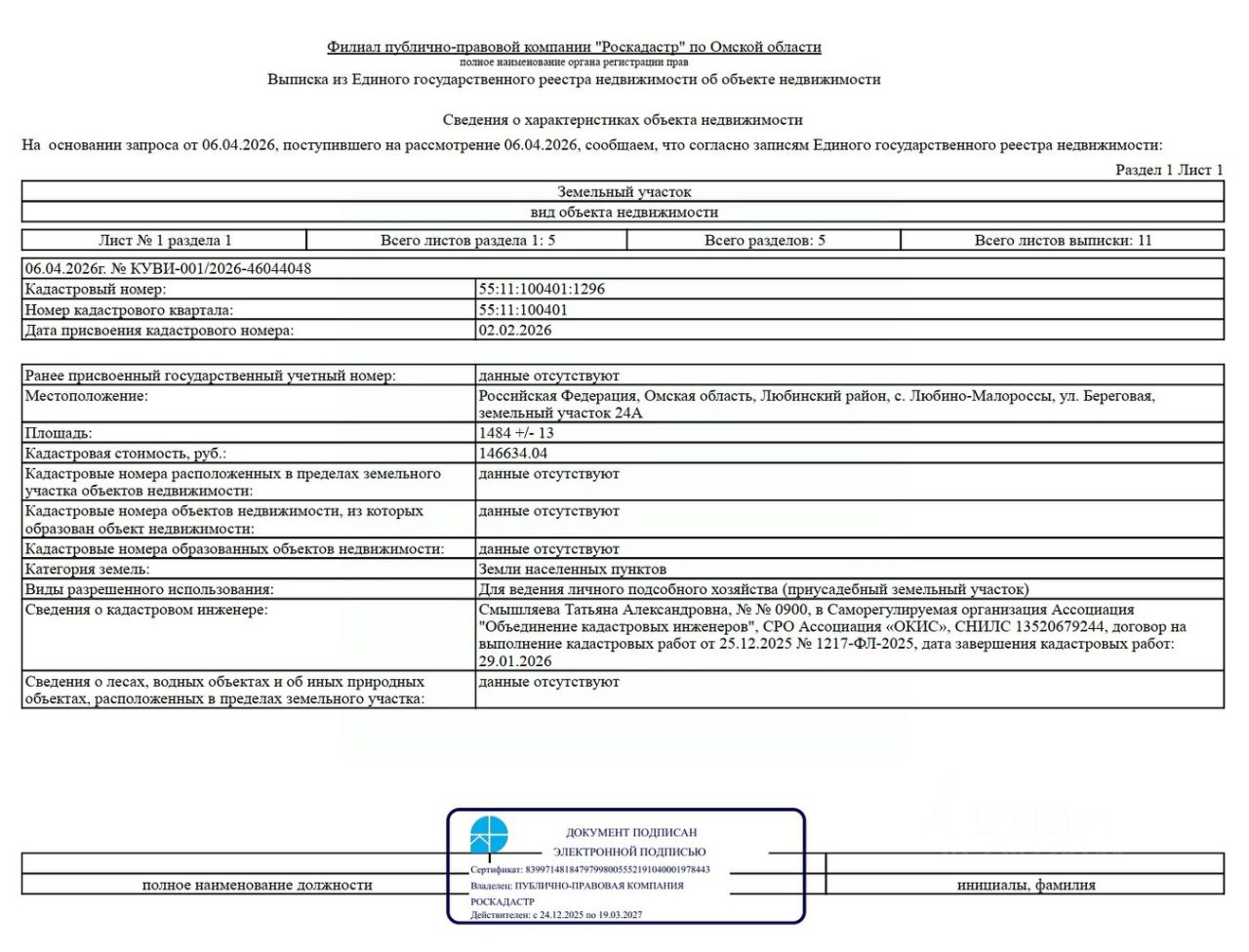 Земельный участок из земель населенных пунктов, расположенный по адресу: Омская область, Любинский район, с. Любино-Малороссы, ул. Береговая, земельный участок 24А, площадью 1484 кв.м, с кадастровым номером 55:11:100401:1296, вид разрешенного использования: для ведения личного подсобного хозяйства (приусадебный земельный участок).