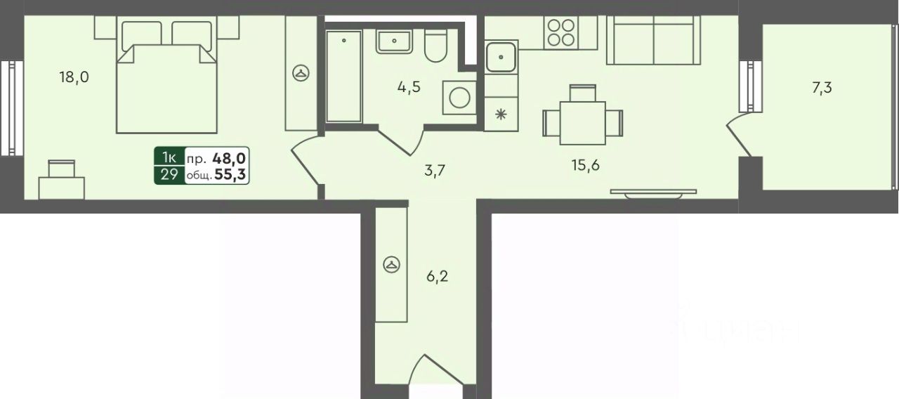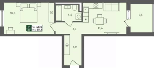 Продаётся 1-комнатная квартира в строящемся доме (ГП 1.1), срок сдачи: IV-кв. 2025, общей площадью 55.3 кв.м., на 1 этаже.