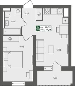 Продаётся 1-комнатная квартира в строящемся доме (ГП 2.1), срок сдачи: III-кв. 2026, общей площадью 44.91 кв.м., на 1 этаже.