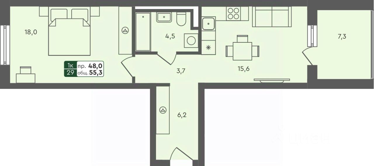 Продаётся 1-комнатная квартира в строящемся доме (ГП 1.1), срок сдачи: IV-кв. 2025, общей площадью 55.3 кв.м., на 1 этаже.