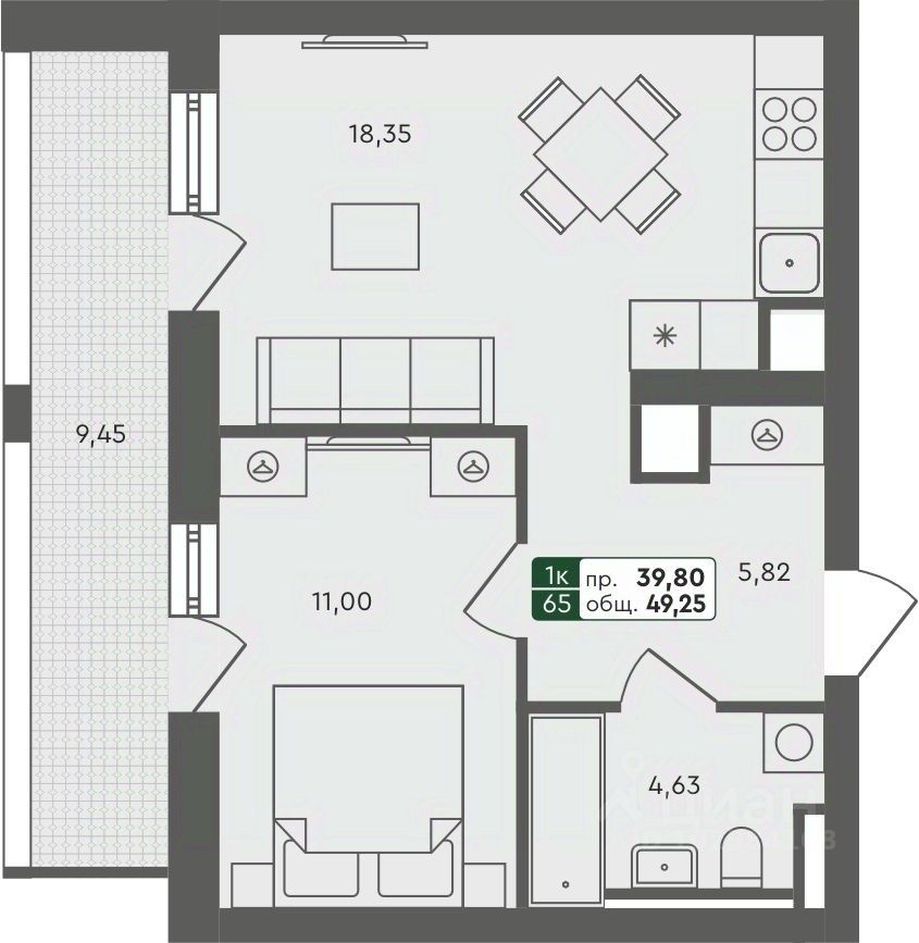 Продаётся 1-комнатная квартира в строящемся доме (ГП 2.1), срок сдачи: III-кв. 2026, общей площадью 49.25 кв.м., на 7 этаже.