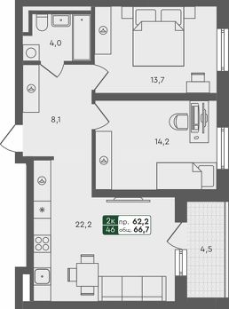 Продаётся 2-комнатная квартира в строящемся доме (ГП 1.1), срок сдачи: IV-кв. 2025, общей площадью 66.7 кв.м., на 1 этаже.