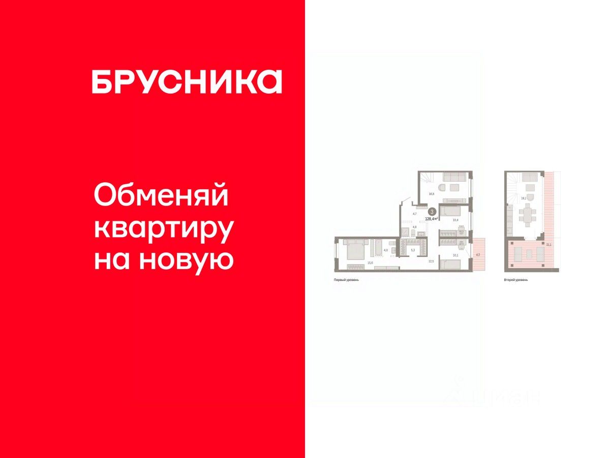 Двухуровневая квартира с кухней-гостиной и тремя спальнями в Кварталах Драверта. Особенности планировки: балкон, вид во двор, гардеробная, двухуровневая, мастер-спальня, предчистовая отделка, разнесённые спальни, терраса на крыше.