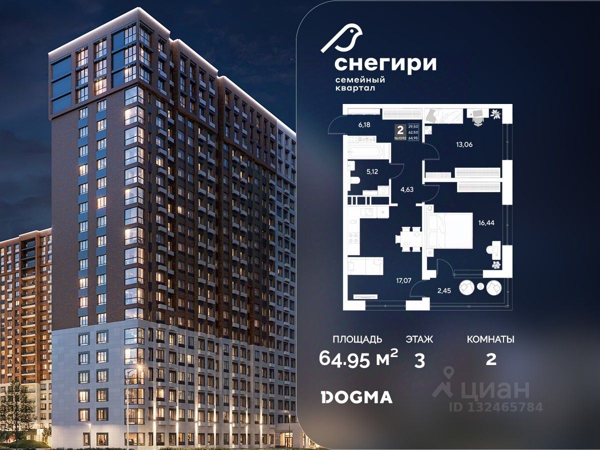 В продаже 2-комнатная квартира от застройщика DOGMA! ЖК "Снегири", г. Омск, Литер 2 Срок сдачи: (4 кв. 2027, общей площадью 64.95 кв.м., на 3 этаже.) Район для счастливой жизни