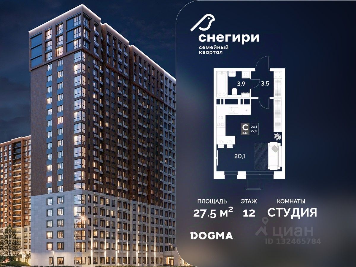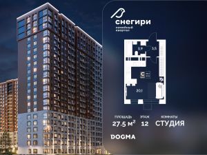 В продаже Студия от застройщика DOGMA! ЖК "Снегири", г. Омск, Литер 1 Срок сдачи: (4 кв. 2027, общей площадью 27.5 кв.м., на 12 этаже.) Район для счастливой жизни