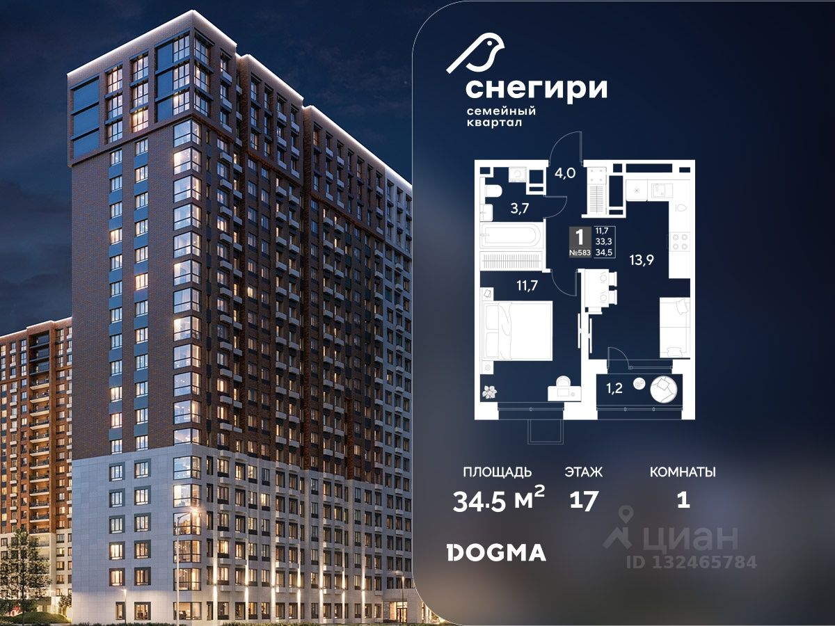 Срок сдачи: 4 кв. 2027, общей площадью 34.5 кв.м., на 17 этаже.