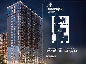В продаже Студия от застройщика DOGMA! ЖК "Снегири", г. Омск, Литер 1 Срок сдачи: (4 кв. 2027, общей площадью 27.5 кв.м., на 12 этаже.) Район для счастливой жизни
