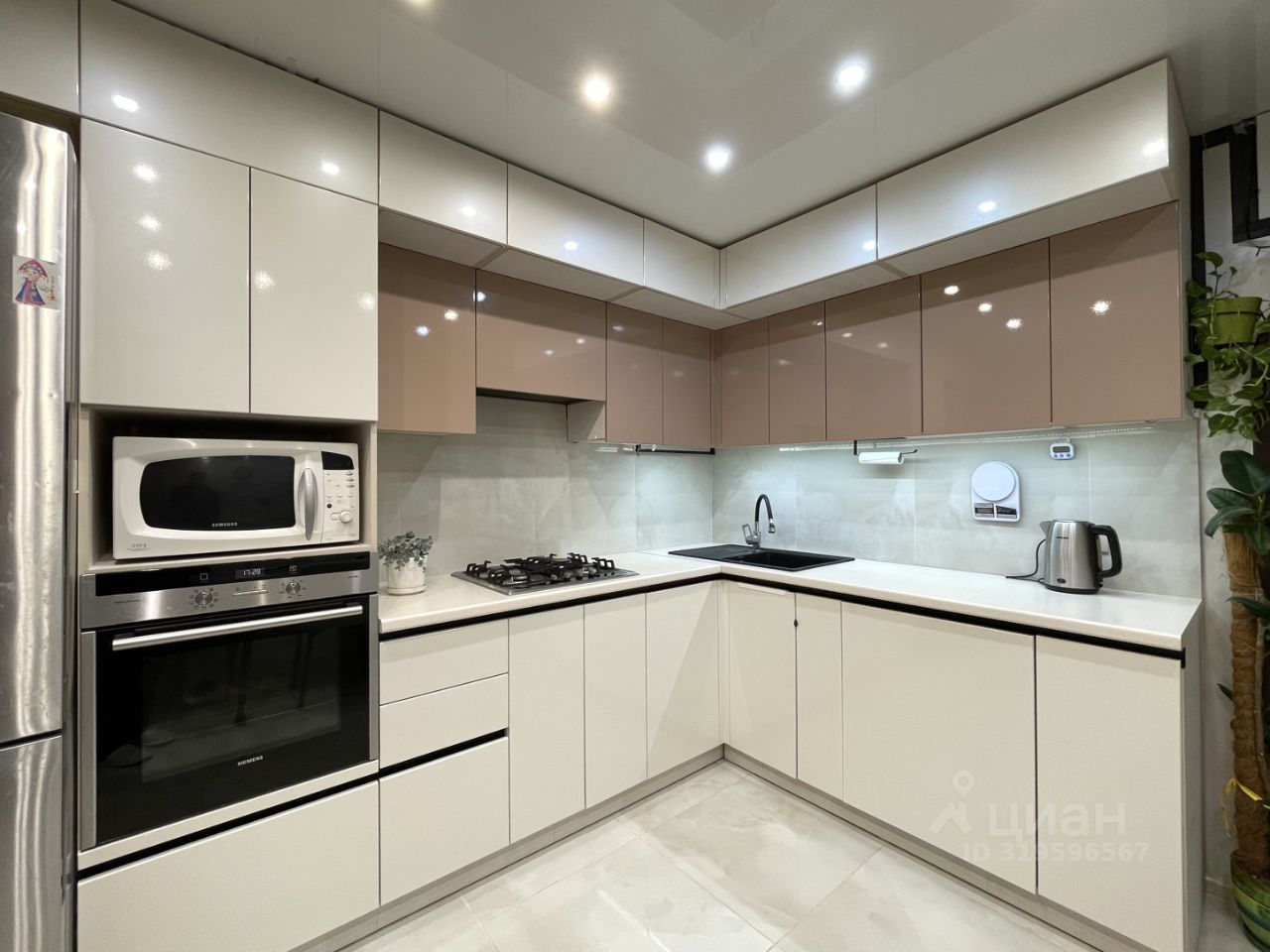 На просторной светлой кухне под плиткой электрический тёплый пол. На кухне остаётся кухонный гарнитур.