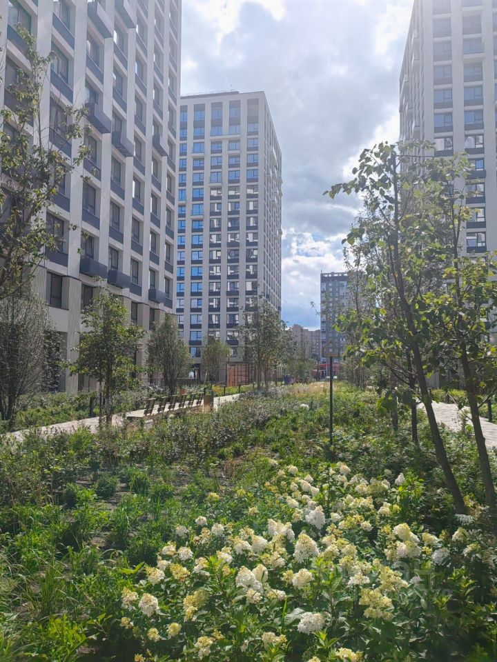 Большой, огороженный внутренний двор (вход только для жителей дома), в котором нет машин, а есть многочисленные пешеходные зоны, вымощенные тротуарной плиткой со скамейками, детские игровые зоны и современные ландшафтные решения с многочисленными кустарниками и деревьями (в т.ч. крупномерными).