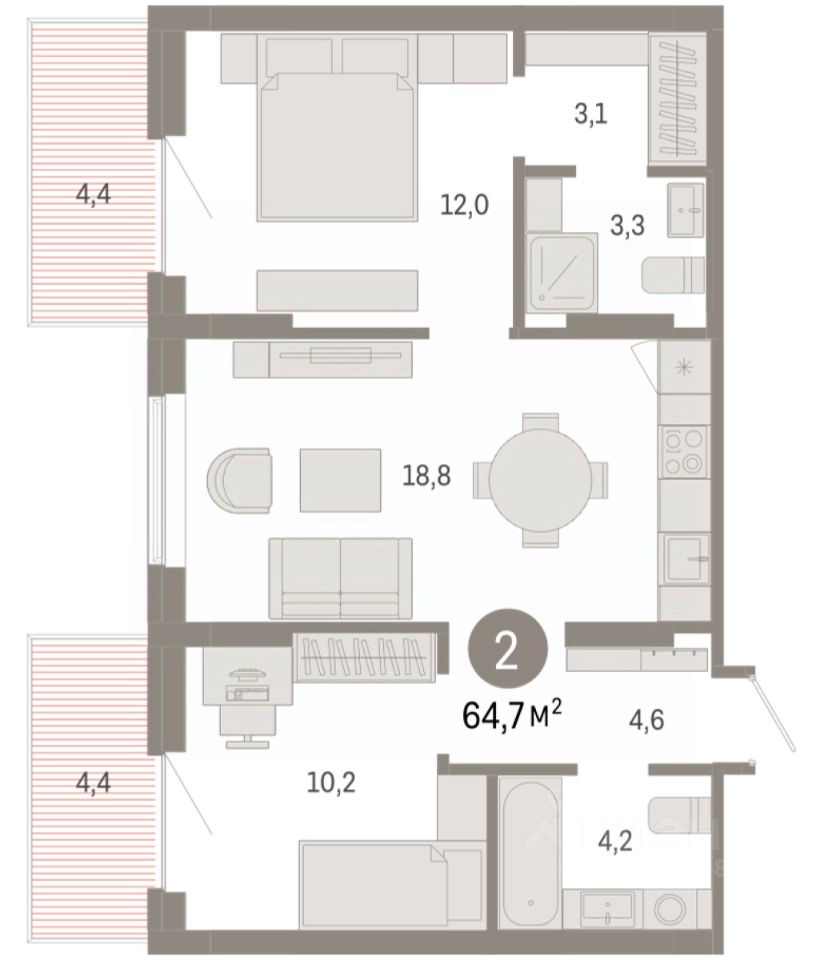 Квартира с кухней-гостиной и двумя спальнями в Кварталах Драверта. Особенности планировки: гардеробная, разнесённые спальни, предчистовая отделка, мастер-спальня, балкон.