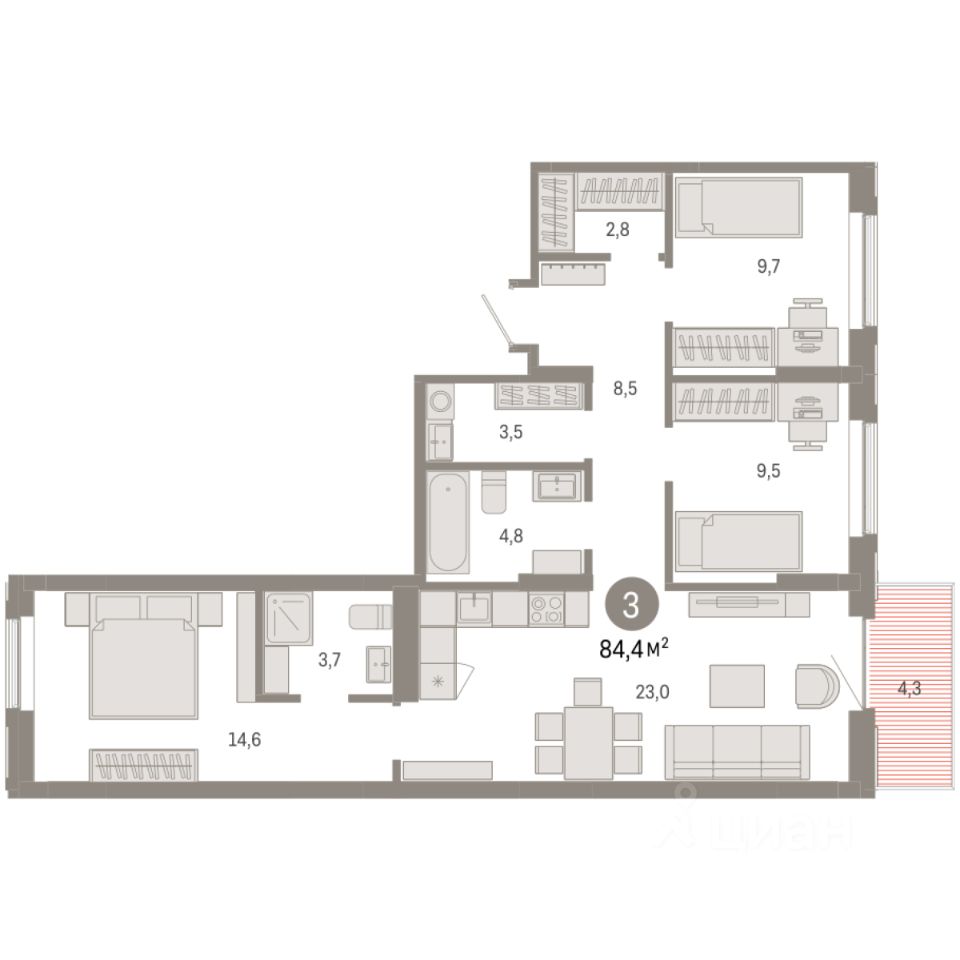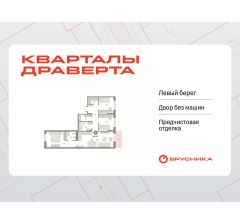 Квартира с кухней-гостиной и тремя спальнями в Кварталах Драверта. Особенности планировки: окна на две стороны, гардеробная, вид во двор, разнесённые спальни, предчистовая отделка, мастер-спальня, постирочная, балкон.