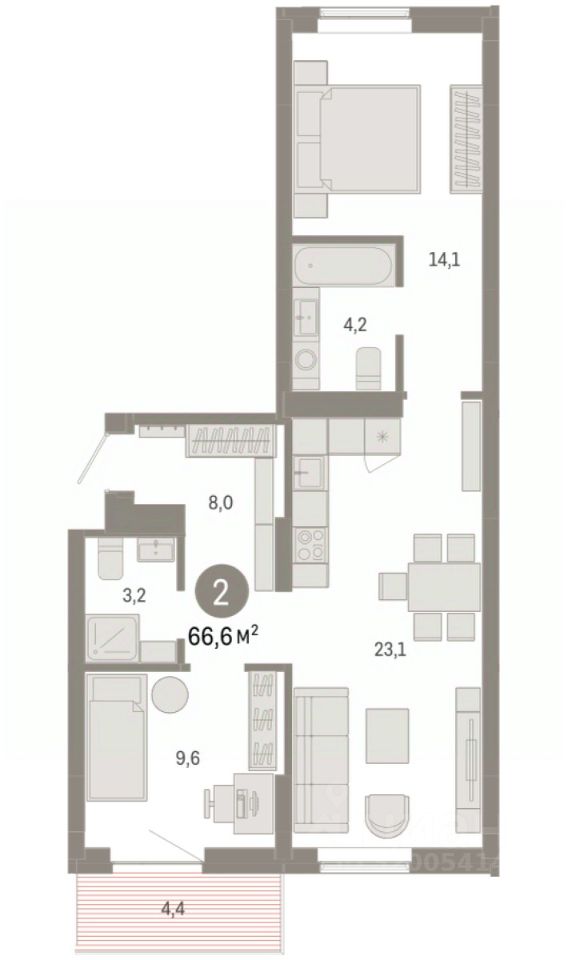 Квартира с кухней-гостиной и двумя спальнями в Кварталах Драверта. Особенности планировки: окна на две стороны, вид во двор, разнесённые спальни, предчистовая отделка, мастер-спальня, балкон.