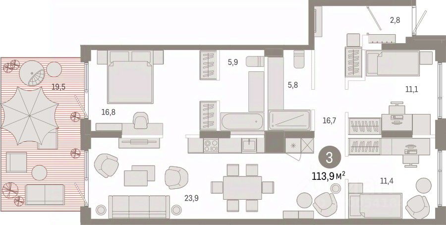 Квартира с кухней-гостиной и тремя спальнями в Кварталах Драверта. Особенности планировки: окна в пол, вид во двор, отдельный вход, панорамное остекление, предчистовая отделка, терраса.
