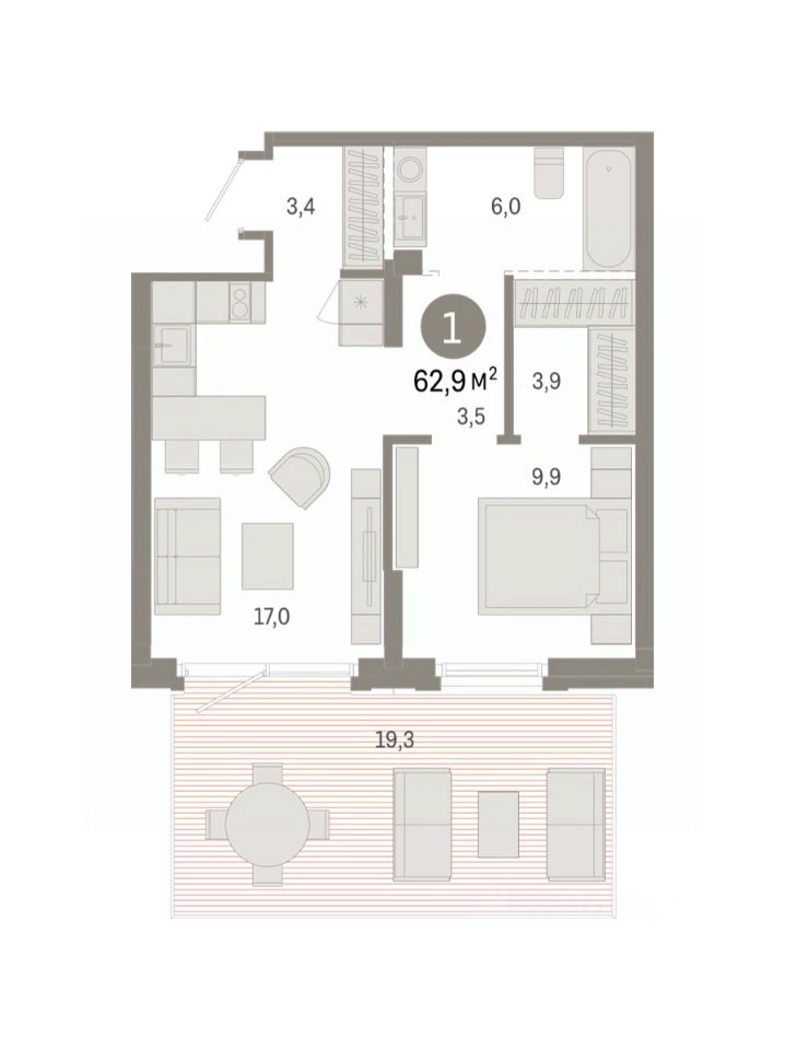 Квартира с кухней-гостиной и одной спальней в Кварталах Драверта. Особенности планировки: гардеробная, вид во двор, панорамное остекление, предчистовая отделка, мастер-спальня, терраса.