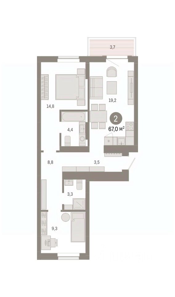 2-комн. квартира от застройщика с предчистовой отделкой в Кварталы Драверта на 6 этаже. Общая площадь: 67.03 кв.м. Высота потолков 2.7 м.