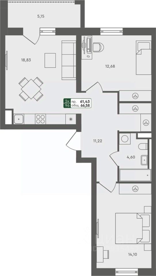 Продаётся 2-комнатная квартира в строящемся доме (ГП 2.1), срок сдачи: III-кв. 2026, общей площадью 66.58 кв.м., на 6 этаже.