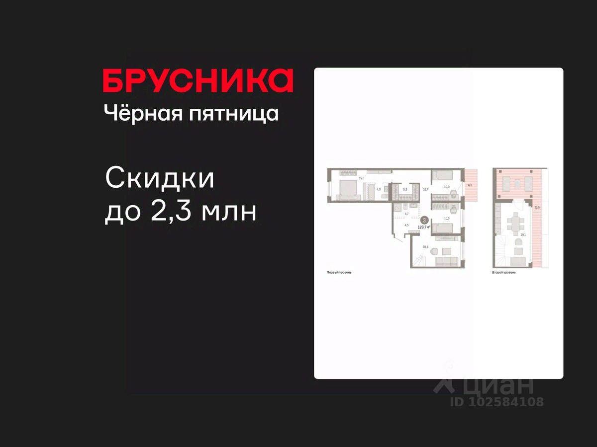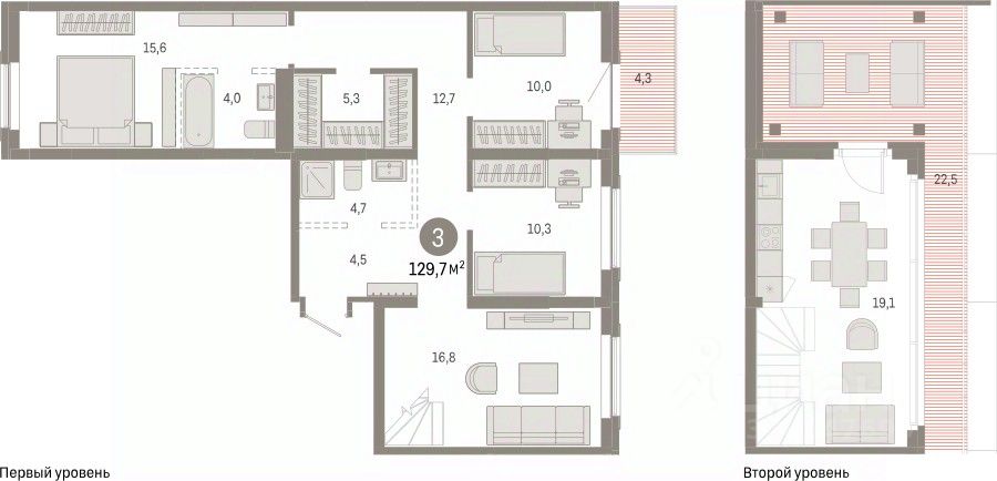 Двухуровневая квартира с кухней-гостиной и тремя спальнями в Кварталах Драверта. Особенности планировки: гардеробная, двухуровневая, вид во двор, разнесённые спальни, предчистовая отделка, мастер-спальня, балкон, терраса на крыше.