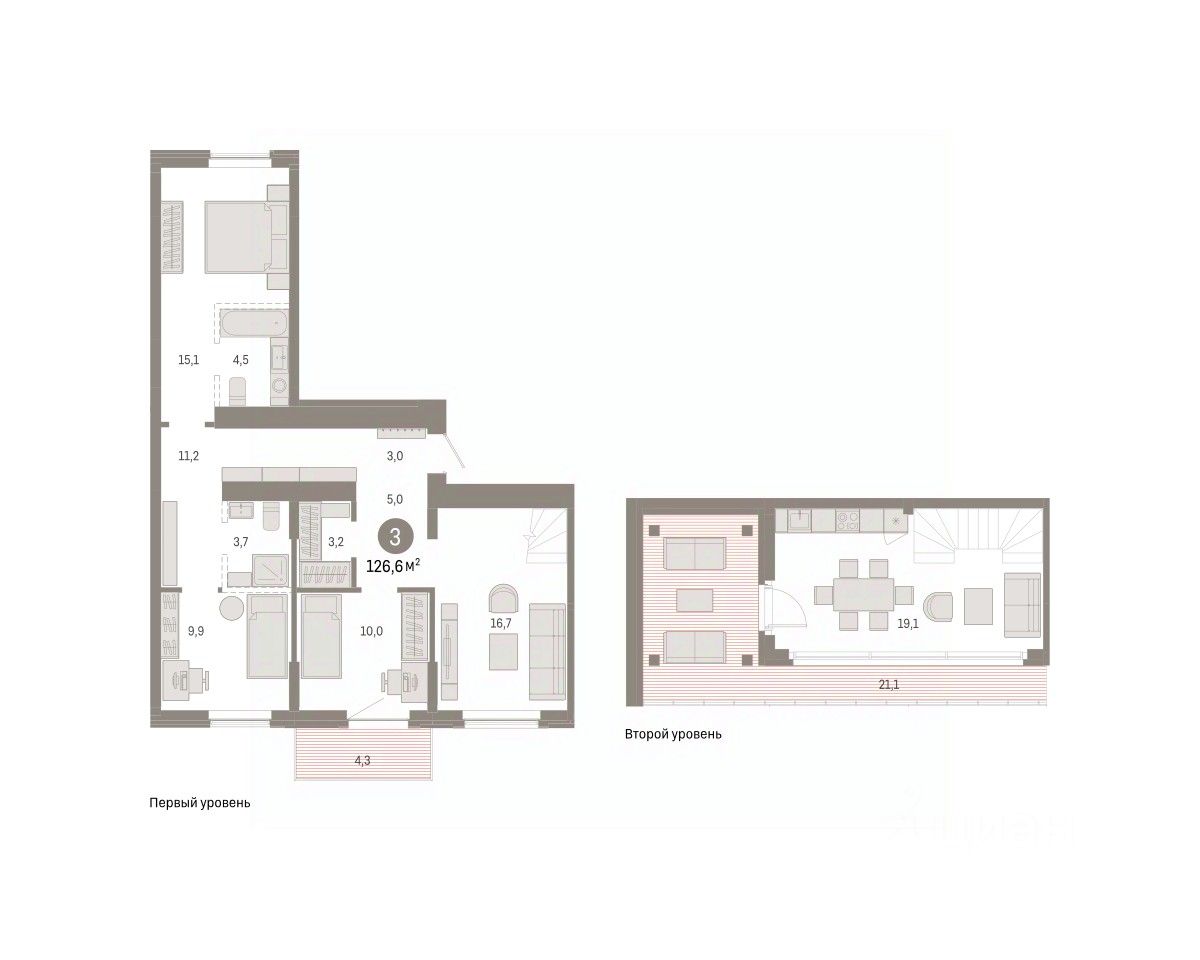 Двухуровневая квартира с кухней-гостиной и тремя спальнями в Кварталах Драверта. Особенности планировки: гардеробная, двухуровневая, вид во двор, разнесённые спальни, предчистовая отделка, мастер-спальня, балкон, терраса на крыше.