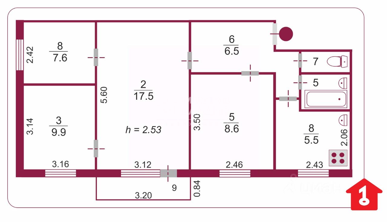 4 спальни, полноценная кухня и совмещенный санузел.