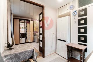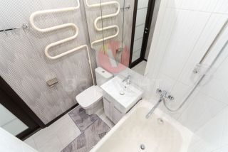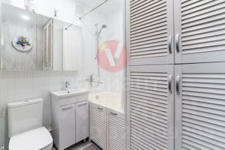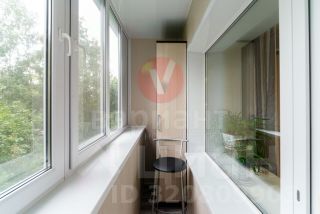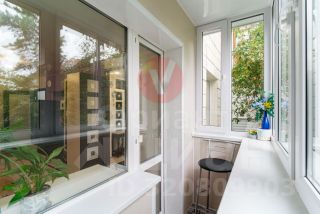 Балкон застеклен ПВХ, стеклопакеты в комнате и кухне, пол — линолеум + кафельная плитка. Новая сантехника.